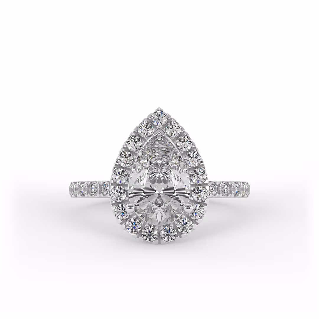 טבעת אירוסין היילו מרשימה עם יהלום טיפה במרכז שמוקף ביהלומי צד עגולים במשקל כולל של 0.4 קראט ששובצו גם לאורך הטבעת