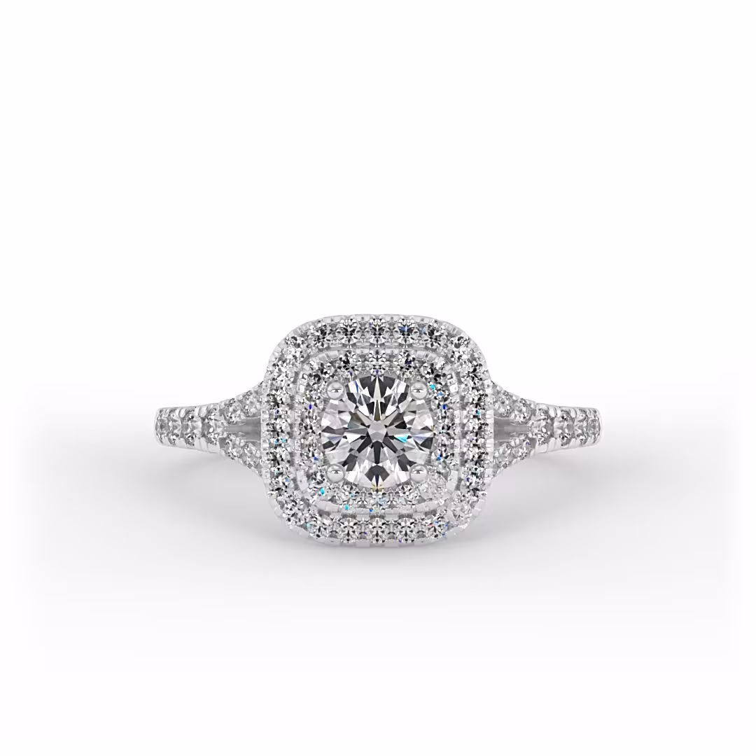 טבעת אירוסין היילו יוקרתית עם יהלום עגול במרכז המוקף בשתי שורות של יהלומי צד עגולים במשקל כולל של 0.55 קראט ששובצו גם לאורך הטבעת
