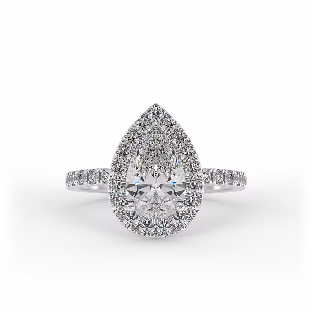 טבעת אירוסין היילו אלגנטית עם יהלום בצורת טיפה המוקף ביהלומי צד עגולים במשקל כולל של 0.42 קראט המשובצים גם בצידי הטבעת