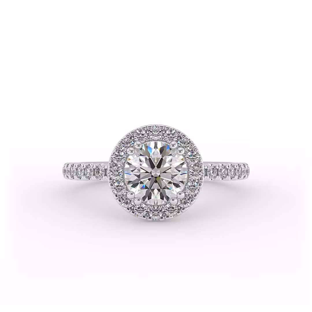 טבעת אירוסין היילו יוקרתית עם יהלום עגול מרכזי שמוקף ביהלומי צד עגולים במשקל כולל של 0.38 קראט שמשובצים גם משני צידי הטבעת