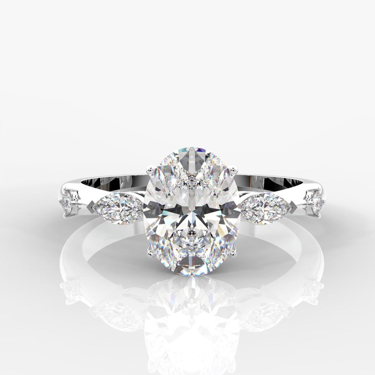 An impressive engagement ring with a central oval-cut diamond, set with sparkling side diamonds that add a glamorous and elegant look to it. Made of shiny white gold, the ring gives an elegant and luxurious presence that is suitable for the most important moments. Also available in yellow or rose gold, according to your personal taste.
