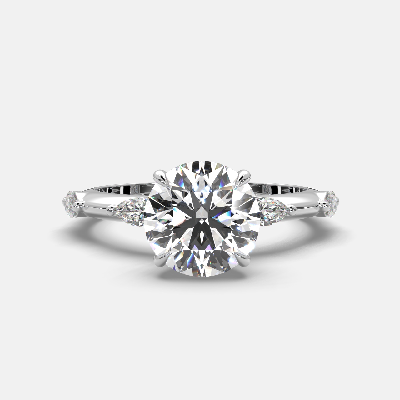 A classic and elegant engagement ring with a bright round central diamond, combined with spectacular marquise-cut side diamonds that upgrade the appearance of the ring and add luxury and delicacy to it. The ring is available in your choice of white, yellow or red gold.