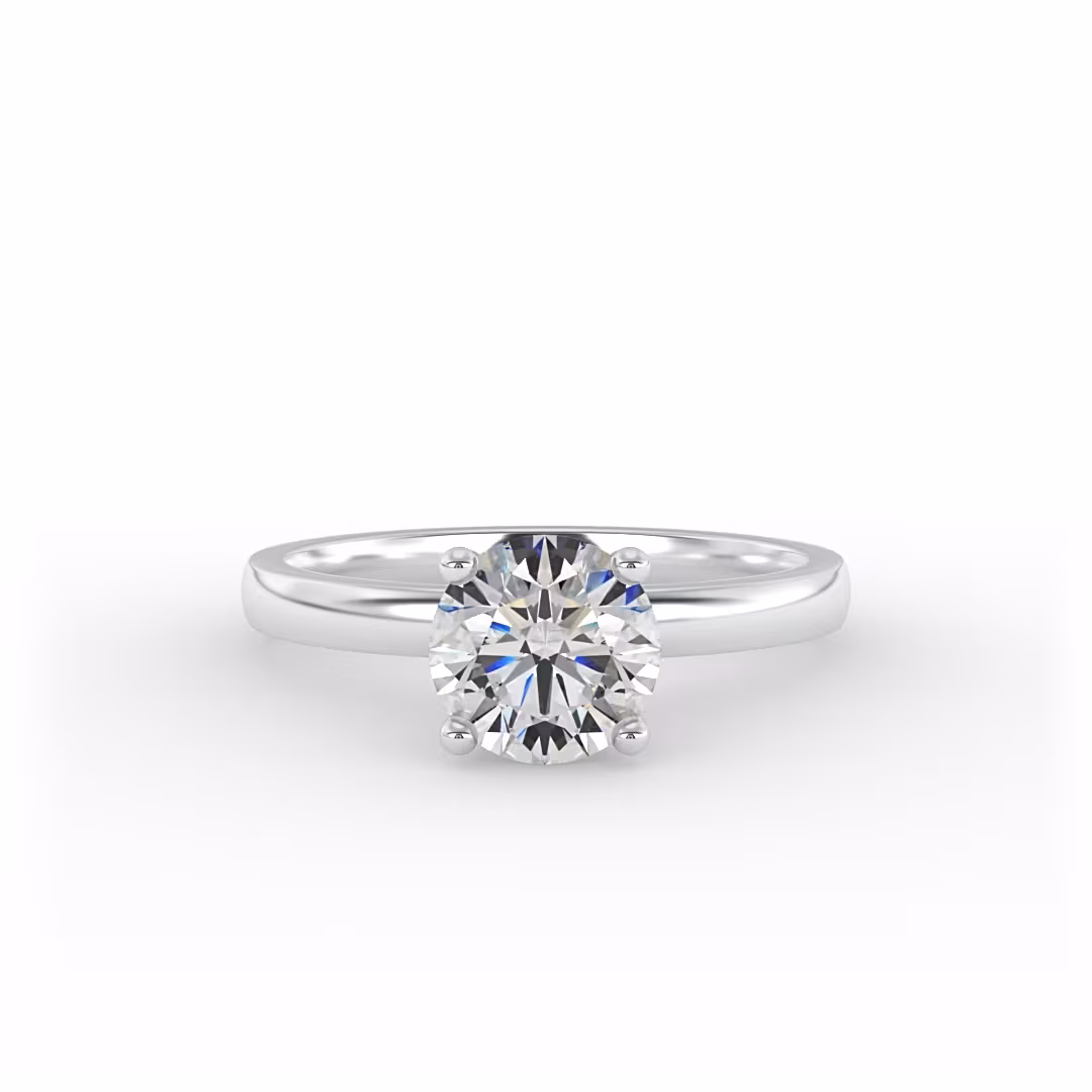 A classic solitaire engagement ring. A round center diamond in the ring with a clean and elegant look.
