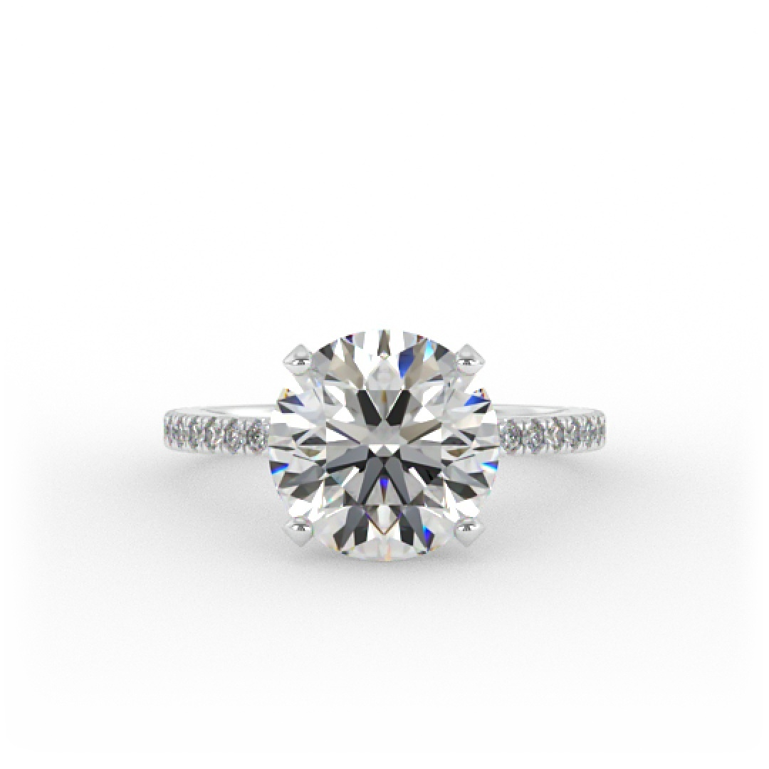 A luxurious engagement ring with a round center diamond and twenty-eight round side diamonds totaling 0.56 carats. White gold engagement ring and also available in yellow gold and rose gold.