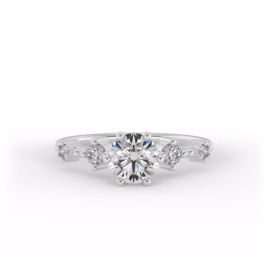 טבעת אירוסין מיוחדת ועדינה עם יהלום עגול במרכז וארבע יהלומי צד במשקל כולל של 0.08 קראט. טבעת אירוסין זהב לבן וזמינה גם בזהב צהוב וזהב ורוד.