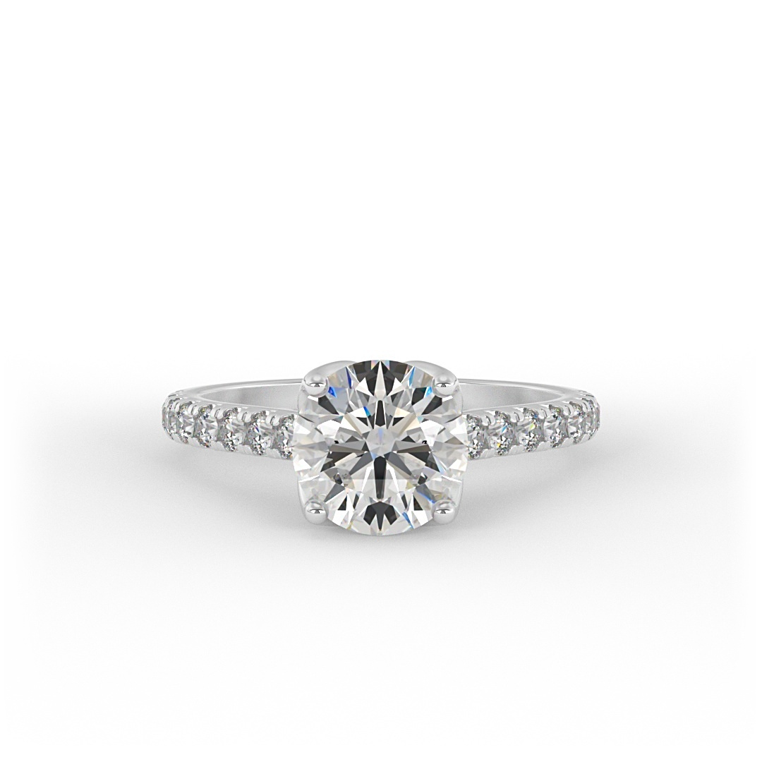 טבעת אירוסין יוקרתית עם יהלום עגול במרכז וששה עשר יהלומי צד עגולים במשקל כולל של 0.3 קראט. טבעת אירוסין זהב לבן וזמינה גם בזהב צהוב וזהב ורוד.