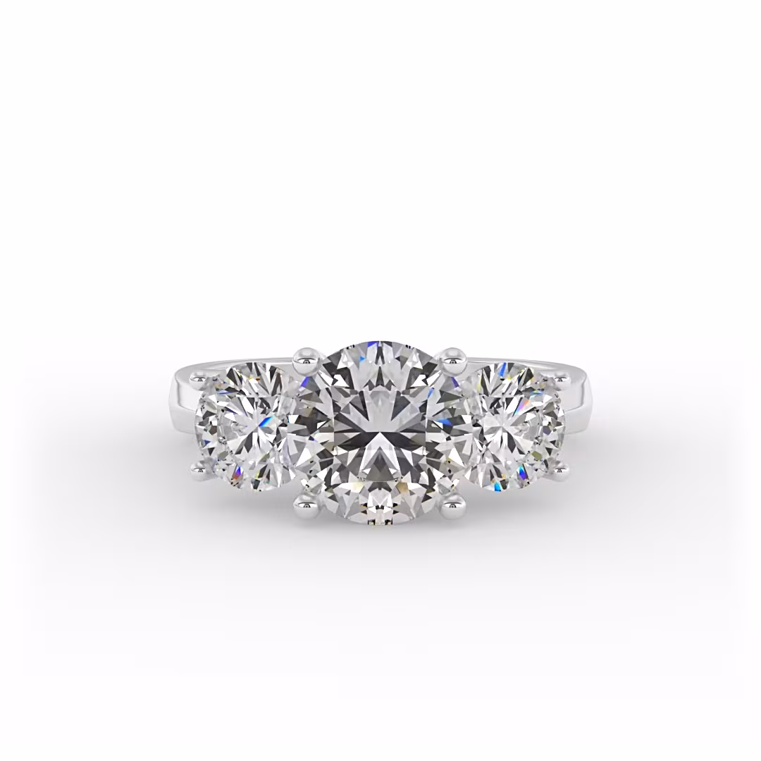 A luxurious three-stone engagement ring with a round center diamond and two round side diamonds with an impressive total weight of 0.8 carats.