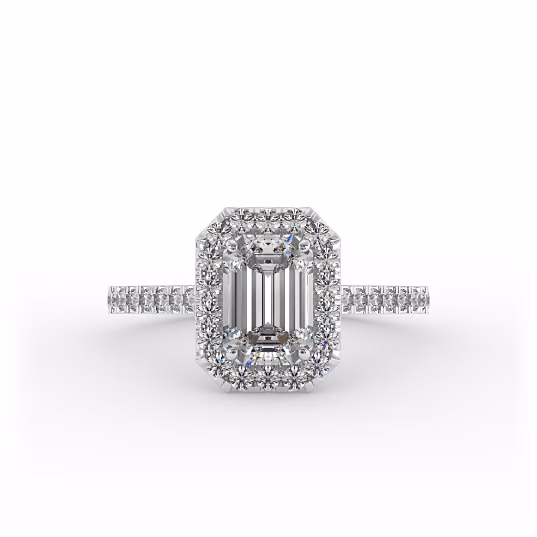 A luxurious engagement ring with a special emerald diamond surrounded by round side diamonds with a total weight of 0.4 carats. White gold engagement ring and also available in yellow gold and rose gold