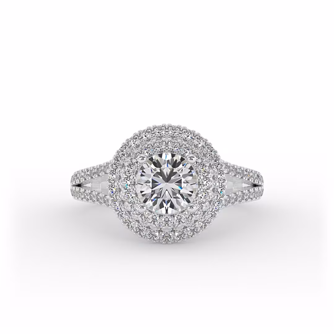 A luxurious engagement ring with a round diamond surrounded by round side diamonds that are also set on the sides of the ring with a total weight of 0.45 carats. White gold engagement ring and also available in yellow gold and rose gold.