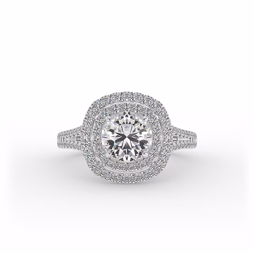 A luxurious engagement ring with a round diamond surrounded by round side diamonds that are also set on the sides of the ring with a total weight of 0.55 carats. White gold engagement ring and also available in yellow gold and rose gold
