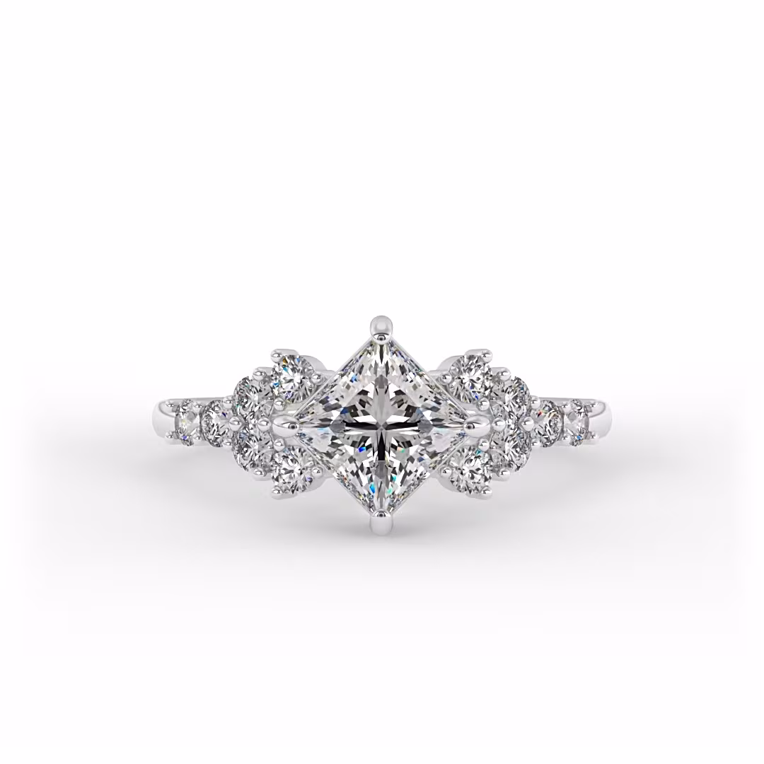 טבעת אירוסין ייחודית עם יהלום נסיכה מרכזי ויהלומי צד עגולים במשקל כולל של 0.22 קראט. טבעת אירוסין זהב לבן וזמינה גם בזהב צהוב וזהב ורוד.