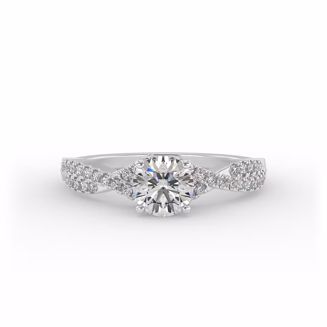 A luxurious engagement ring with a central round diamond and side diamonds totaling 0.3 carats that surround the sides of this special ring. White gold engagement ring and also available in yellow gold and rose gold.