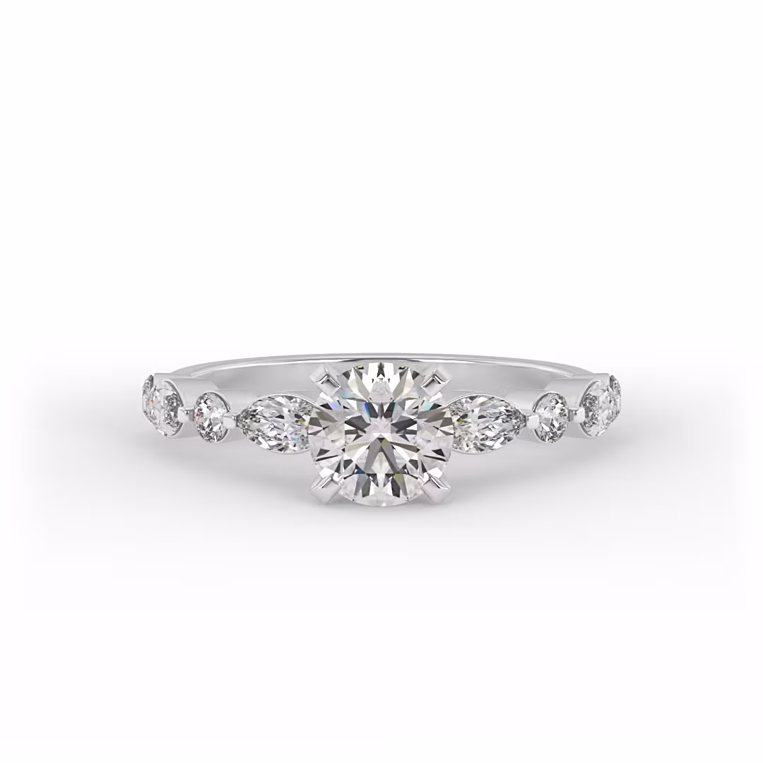 A luxurious engagement ring with a central round diamond, two round diamonds and two marquise diamonds on each side with a total weight of 0.38 carats. White gold engagement ring and also available in yellow gold and rose gold.